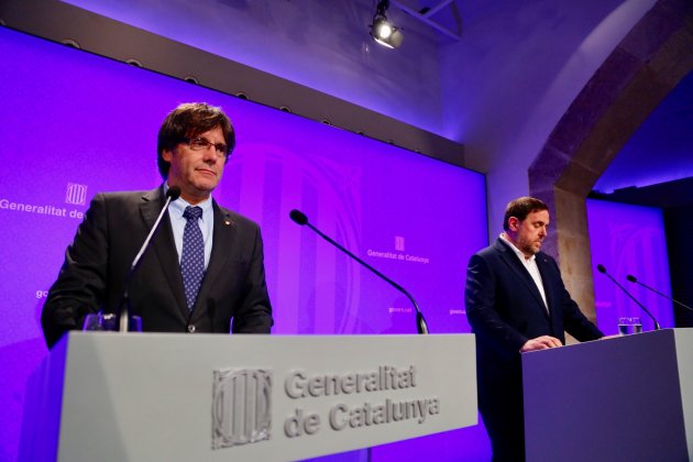 Carles Puigdemont, president de la Generalitat, y Oriol Junqueras, vicepresident, comparecen ante los medios.