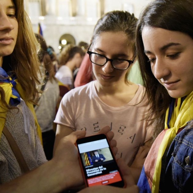Los concentrados delante de la Generalitat han seguido el discurso de Puigdemont desde el móvil