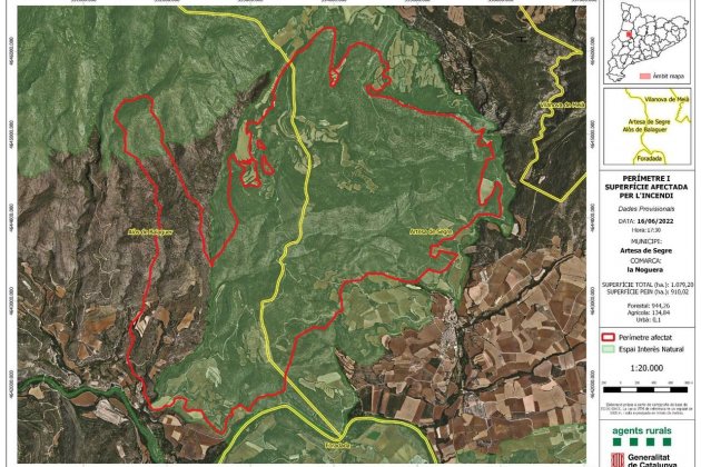 Imagen del perímetro y de la superficie de la zona del incendio de Artesa de Segre, según los datos recogidos por Agents Rurals. Unas 940 hectáreas. De estas, 847 forman parte del PEIN. La mayoría de hectáreas son forestales y de vegetación.