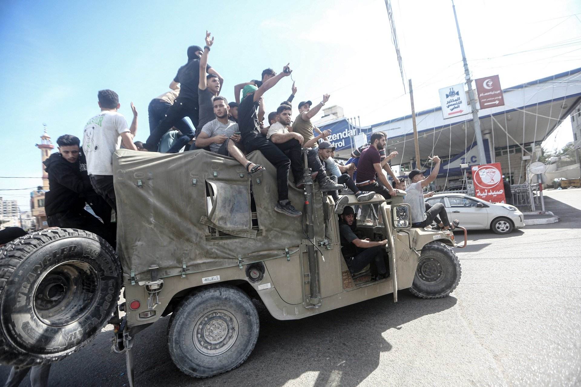Los palestinos toman el control de un vehículo militar israelí después de cruzar la valla fronteriza con Israel desde Jabalia, en el norte de la Franja de Gaza.
