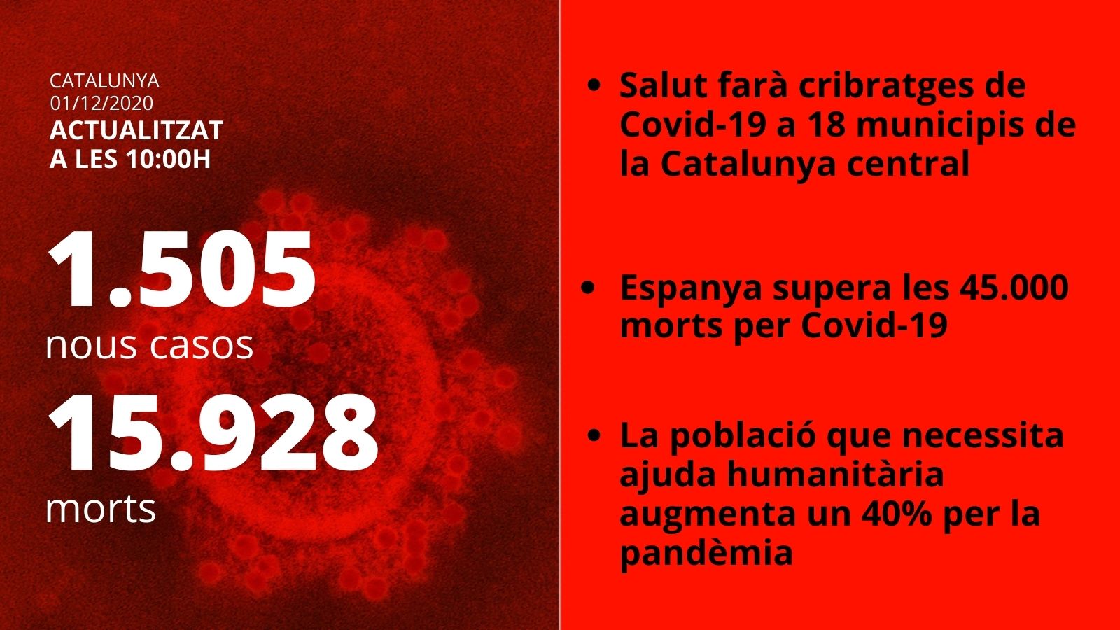 Sube la mortalidad por coronavirus a Catalunya. Se han notificado 62 nuevas víctimas mortales –ayer hubo 36 y domingo 33–, y la cifra total ya se eleva hasta los 15.928.