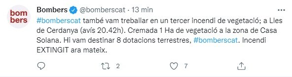 Además de Alcarràs, los Bombers también apagaron un incendio de vegetación en Lles de Cerdanya.