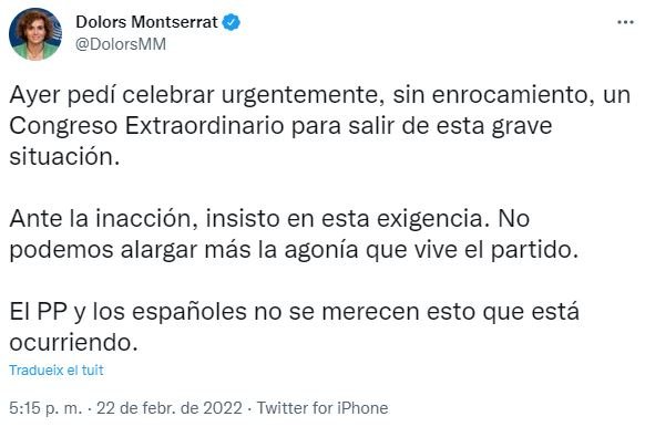 La portavoz del PP en el Parlamento Europeo, la catalana Dolors Montserrat, se ha sumado a la petición de "celebrar urgentemente, sin enrocamientos, un congreso extraordinario" del partido que los ayude a "salir de esta grave situación". "No podemos alargar más la agonía que vive el partido. El PP y los españoles no se merecen lo que está pasando", concluye en un tuit.