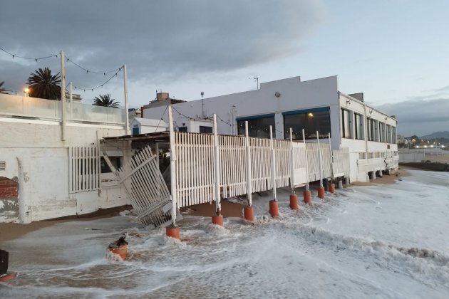 El temporal ha causado desperfectos en la playa de Badalona y ha destrozado parte del restaurante La Donzella, que está a primera línea.
