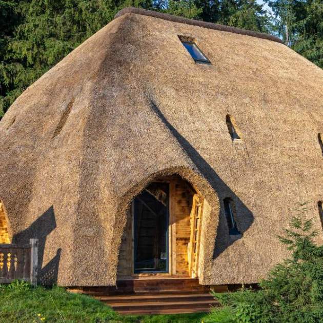 Una casa construida con paja y materiales reciclados
