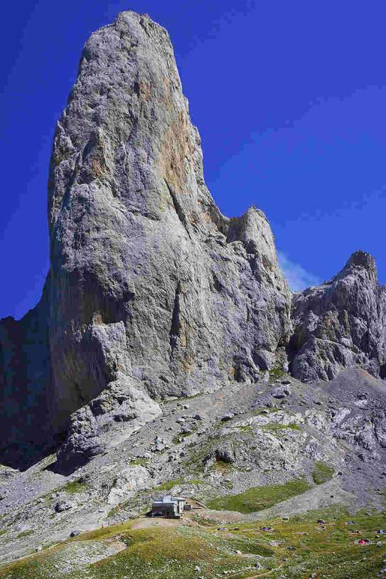 La vista que tendrás delante de tus ojos te dejará boquiabierto. La base del Picu Urriellu está situada a 1.950 metros de altura por encima del nivel del mar. Aparte de la imponente vista de la montaña y el camino que has dejado atrás, también habrás llegado al refugio, conocido con el mismo nombre que el pico. Este refugio es del año 1954, cuando se produjo la primera escalada a la cumbre.