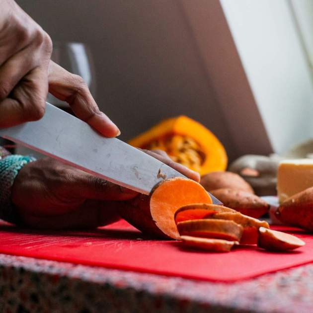 La preparación comienza lavando bien los boniatos y cortándolos por la mitad, realizando unos cortes en forma de cuadrícula para facilitar su cocción. Después, se cortan las puntas de los ajos y se limpian los puerros, dejándolos enteros o partidos si son muy gruesos. Este paso permite que todos los ingredientes se asen de forma uniforme, desarrollando sabores más intensos, notas ligeramente caramelizadas y una textura mucho más rica que si se cocinaran simplemente hervidos.