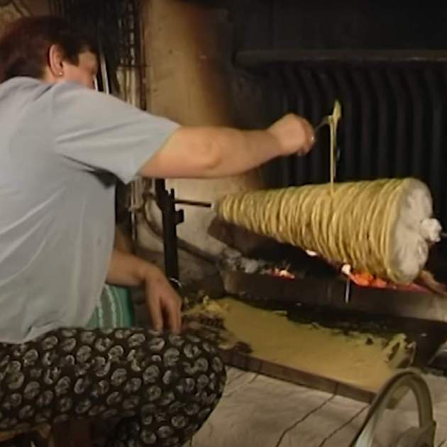 La cocción de este postre requiere tres horas y aproximadamente dos sacos de leña. Un cono de madera de olivo o de cedro sirve de molde para cocinar la pasta. Georgette envuelve el molde con papel de horno, lo fija con un poco de cuerda fina y lo unta con mantequilla antes de ponerlo al lado del fuego. Coloca una bandeja debajo del molde y, con la ayuda de un motor eléctrico, hace girar el molde y empieza a echar la pasta líquida por encima. Antes de la existencia de los motores eléctricos, sin embargo, el molde se tenía que hacer girar a mano a una velocidad constante. La pasta que no se adhiere al molde cae en la bandeja y Georgette la vuelve a echar por encima del cono. De este modo, con paciencia y técnica, la pasta se va solidificando hasta que se acaba cociendo toda. Cuando todo el cono está cocido, solo queda acabar de tostarlo con un par de vueltas más y, al cabo de media hora, cuando la pasta se ha enfriado, ya se puede desmoldar.