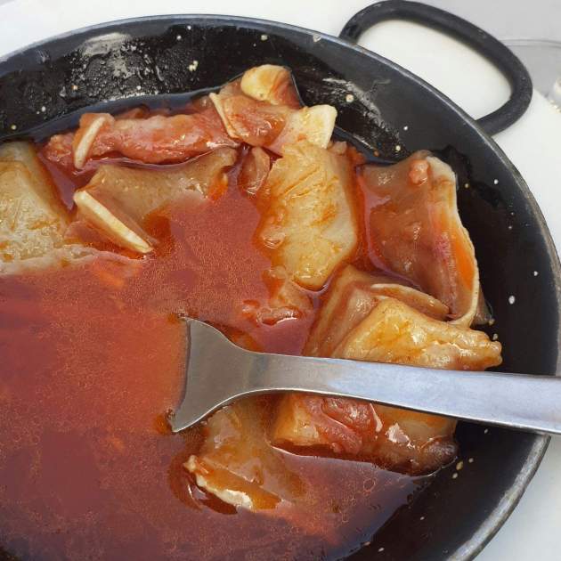 La combinación es muy importante. Por un lado, la gelatina que aporta la carne, con esa textura melosa y densa tan característica. Por otro, el picante, que rompe esa suavidad y añade intensidad en el paladar. De este modo, se consigue un equilibrio que no es fácil de lograr. El plato gana fuerza, carácter y profundidad. No se queda plano, sino que evoluciona en boca. Además, ese contraste hace que el capipota resulte más adictivo. Cada cucharada tiene algo distinto, algo que invita a seguir comiendo.