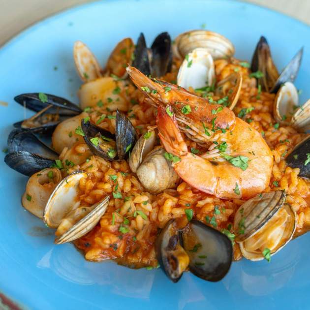A mitad de cocción, se incorporan verduras cortadas en juliana fina y langostinos, manteniendo el equilibrio entre textura y sabor. La cúrcuma aporta color y un matiz especiado, mientras que la ralladura de limón y el verde de la cebolla tierna aportan frescura al final. Todo está pensado para que el socarrat aparezca sin perder jugosidad, demostrando que técnica y creatividad pueden convivir en una misma paella.