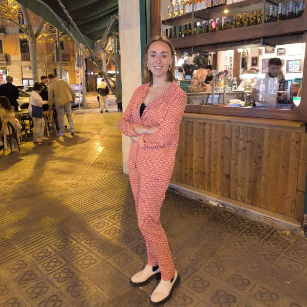 Hoy tocan tapas de las buenas que combinan la cocina catalana con la italiana. El local es muy pequeñín e informal, y su barra de los años 60 es de estas donde no te importa si te toca sentarte porque el local está lleno. Spoiler: hoy probaremos el mejor flan tradicional que nunca me he puesto en la boca, pero no nos adelantemos. Empezamos con un mordisco fresco y exótico, un carpaccio de gambas con salsa de cacahuete y picada de verduritas. La salsa recuerda a un curri tailandés, pero en su versión más suave, la picada le aporta frescor y, sinceramente, más que carpaccio es una señora gamba fresca, carnosa y delicada. Continuamos con otro pescado crudo, una lubina marinada con mayonesa de hierbas y aceite de cebollino, muy ligero.