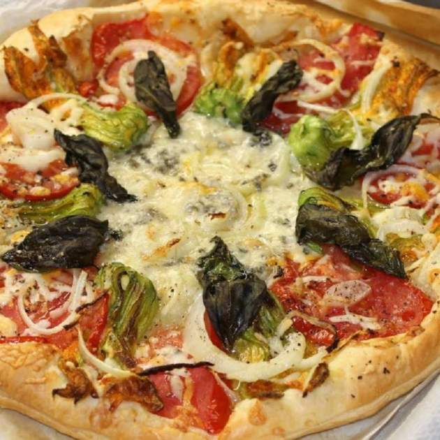 No, no es una pizza, pero hace toda la pinta. Una elaboración bien deliciosa y salada. Excelente combinación de productos frescos y de temporada. Una coca ligera que te hará de entrante, de primero o de segundo plato. La puedes hacer rectangular, cuadrada, redonda, individuales o darle la forma que más te guste. Utilizamos el hojaldre para la base. De esta manera la coca queda más crujiente y sabrosa, pero puedes utilizar pasta brisa o masa de pizza también. Y entonces decirle pizza. Y si no tenéis flores de calabacín, puedes utilizar rodajas de calabacín directamente. Te la recomendamos para cenar, degustarla con tranquilidad, con una copa de vino, una música agradable y todo el tiempo en frente.