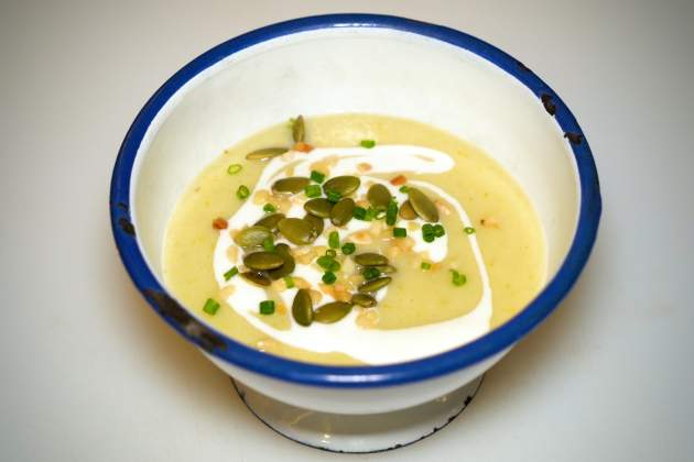 Sacamos los hilos del apio y lo cortamos a trocitos. Pelamos y cortamos la manzana en dados. Picamos la cebolla y pelamos y cortamos las patatas. En una olla ponemos la mantequilla, la manzana, el apio, las patatas y la cebolla. Dejamos que sofría todo un poco. Ponemos sal, pimienta y nuez moscada. La nuez moscada tiene que ser la última para que no se queme. Inmediatamente, añadimos el agua o el caldo de verduras. Y dejamos que cueza unos diez, quince minutos. Una vez estén todos los ingredientes cocidos (blandos al tocarlos), trituramos bien fino. Servimos en un plato y acabamos con yogur natural, frutos secos y cebollino picado.