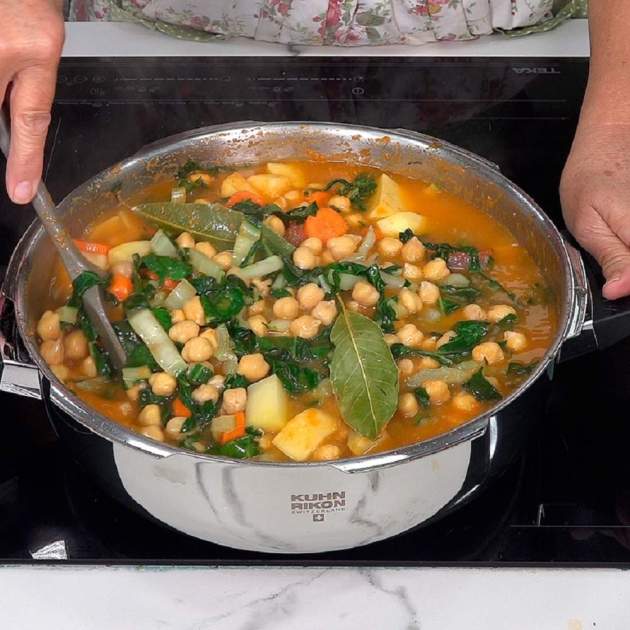 Los garbanzos, ya cocidos para ahorrar tiempo, son el corazón nutricional de esta receta. Son una fuente excelente de proteínas vegetales, hierro y fibra soluble, que favorece la saciedad y ayuda a regular los niveles de colesterol. Además, aportan una sensación de bienestar y energía sostenida, ideal para afrontar la jornada con vitalidad. Añadir las acelgas —o espinacas, si se prefiere una versión más suave— en los últimos minutos de cocción, garantiza que mantengan su color verde intenso y la mayor parte de sus nutrientes. Su contenido en ácido fólico, calcio y magnesio las convierte en un aliado valioso para la salud cardiovascular y ósea.