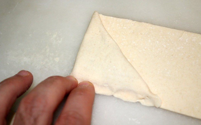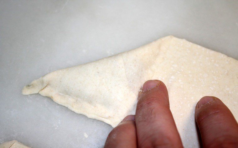 La cerraremos sobre ella misma... haciendo un triángulo. Tenéis que sellar las dos esquinas haciendo que se peguen las capas de hojaldre. Podéis mojar la zona con un poco de agua, con el mismo dedo.