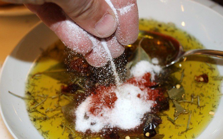 Y por último, una cucharada grande de sal. Vaya, sal suficiente para salar toda la carne. Yo lo hago a ojo.