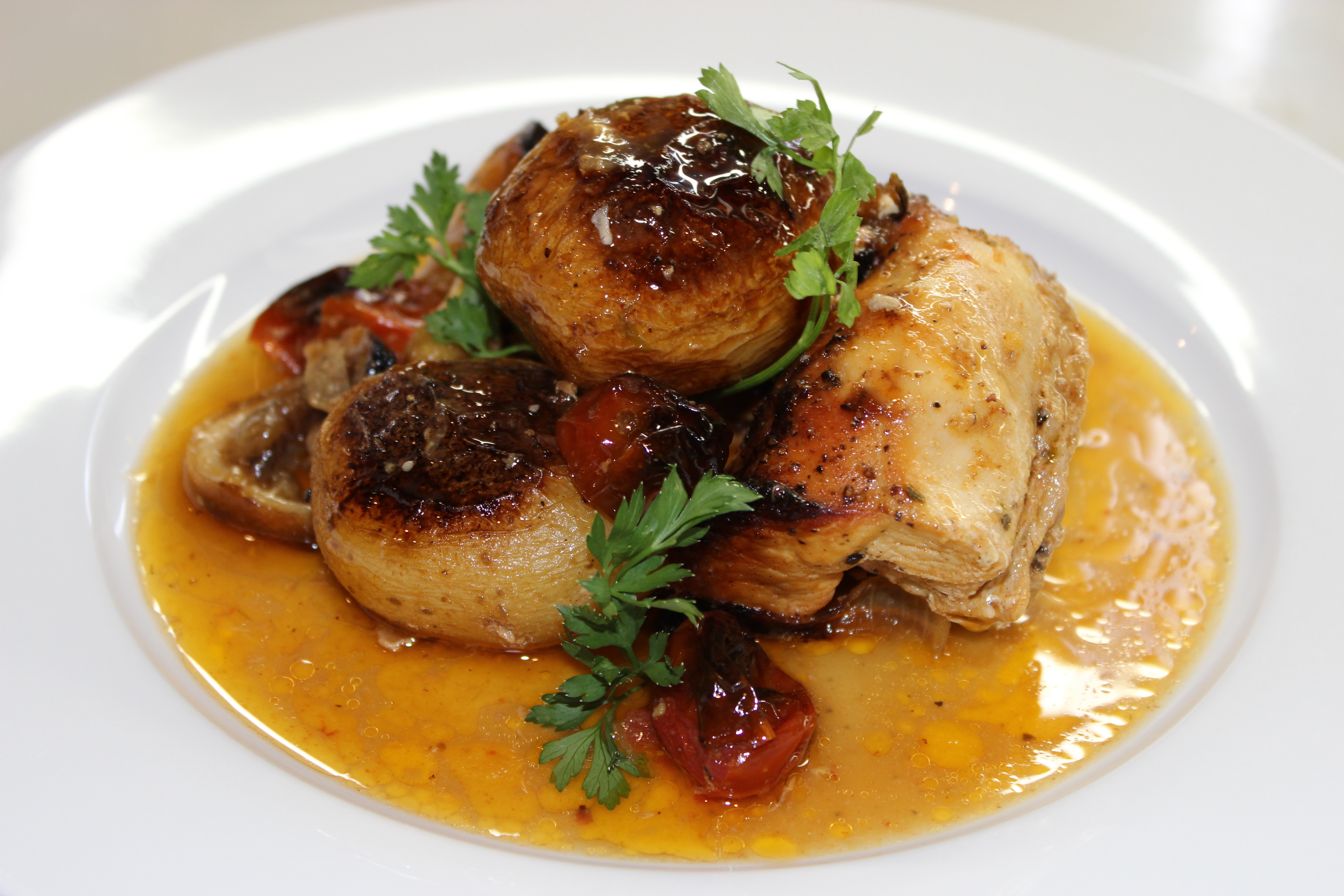 Rollitos de pollo rellenos de espárragos y guanciale acompañados de patatas aplastadas