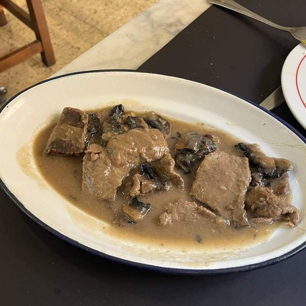 Nos sirven también una torre de champiñones, presentada en forma piramidal y con el producto sin artificios; bien marcados por fuera y tiernos en el interior. El jugo que queda en el fondo del plato, mezcla del ajo y el perejil con el aceite, pide pan. También pide mojar pan el fricandó, servido en una bandeja ovalada. Los cortes de ternera, finos y tiernos, se envuelven con una salsa melosa de setas que intensifica su sabor. Un plato bien ejecutado, sin giros sorprendentes, pero reconfortante.
