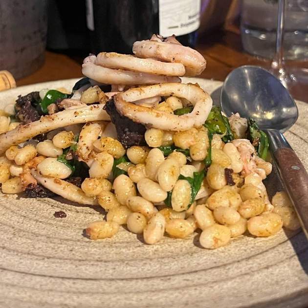 Desde la carta de vinos me mira el retrato de un hombre que por pelo y barba tiene gotas de uva. “A ver qué eliges, Molinero, que nos conocemos”, creo que me dice. Las opciones son muchas y variadas y, finalmente, la botella elegida es Les Graviers 2021 de Bénédicte y Stéphane Tissot, unos maestros de la vitivinicultura natural al Jura que han embotellado un blanco de Chardonnay elegante y exquisito a un precio muy razonable. Las copas están a la altura igual que el servicio, simpático y cercano, sin perder una pizca de profesionalidad, cosa que garantiza que el vino será disfrutado como es debido, honrando así a la viña y a los elaboradores que la han visto nacer y crecer.