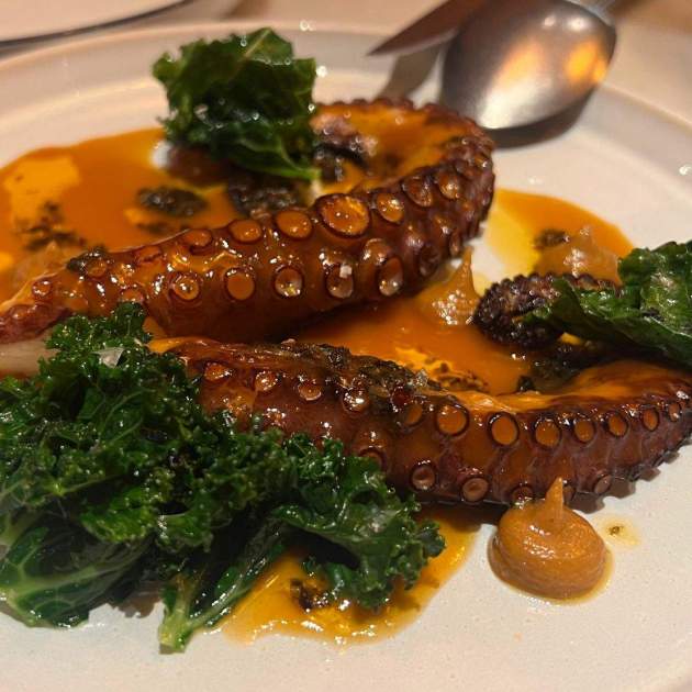 Las setas, de temporada, hacen acto de presencia en un plato muy goloso de pasta fresca similar a los maltagliati, acelgas, un velo de papada y huevo. Remata el trabajo una pata de pulpo con espuma de chorizo y chimichurri. Para beber, pagamos un Campo das Probas 2015 de Quinta da Muradella, un vino singular que forma parte de la amplia oferta de vinos gallegos y catalanes de Batea.