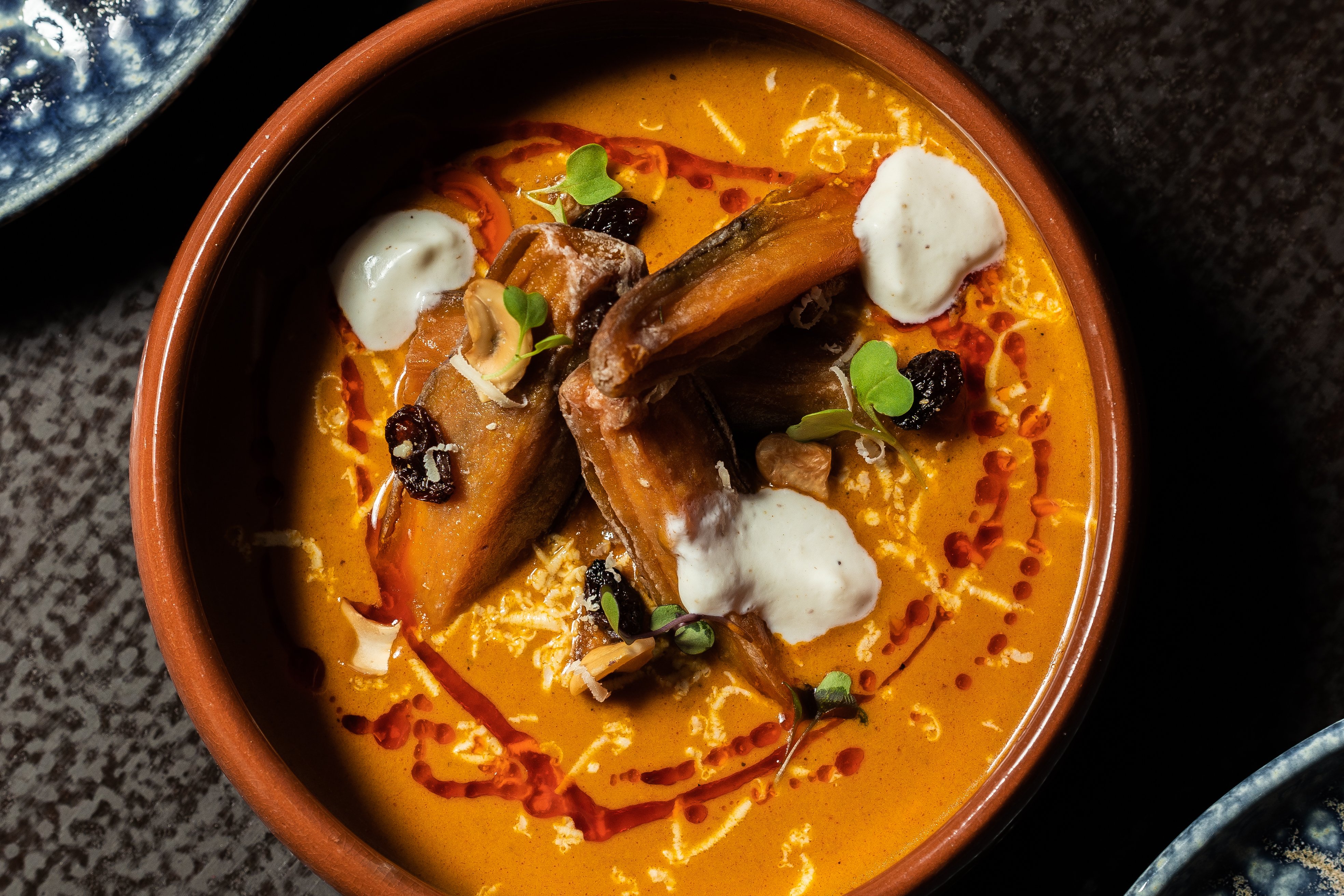 Empezamos con el gol gappa, es decir, unas bolas de sémola, tamarindo sazonado, agua de gaseosa con cilantro y lentejas tostadas; la bola en cuestión se come de golpe y explota en la boca mezclando los sabores. Continuamos con el shicampuri kabab, carne picada de cordero con especias molidas en la piedra y espuma de remolacha; dicen que antiguamente era un plato de ricos, ya que la leyenda explica que masticar era cosa de pobres, y en esta elaboración el cordero ha sido triturado hasta cuatro veces, de manera que se acaba deshaciendo en la boca.