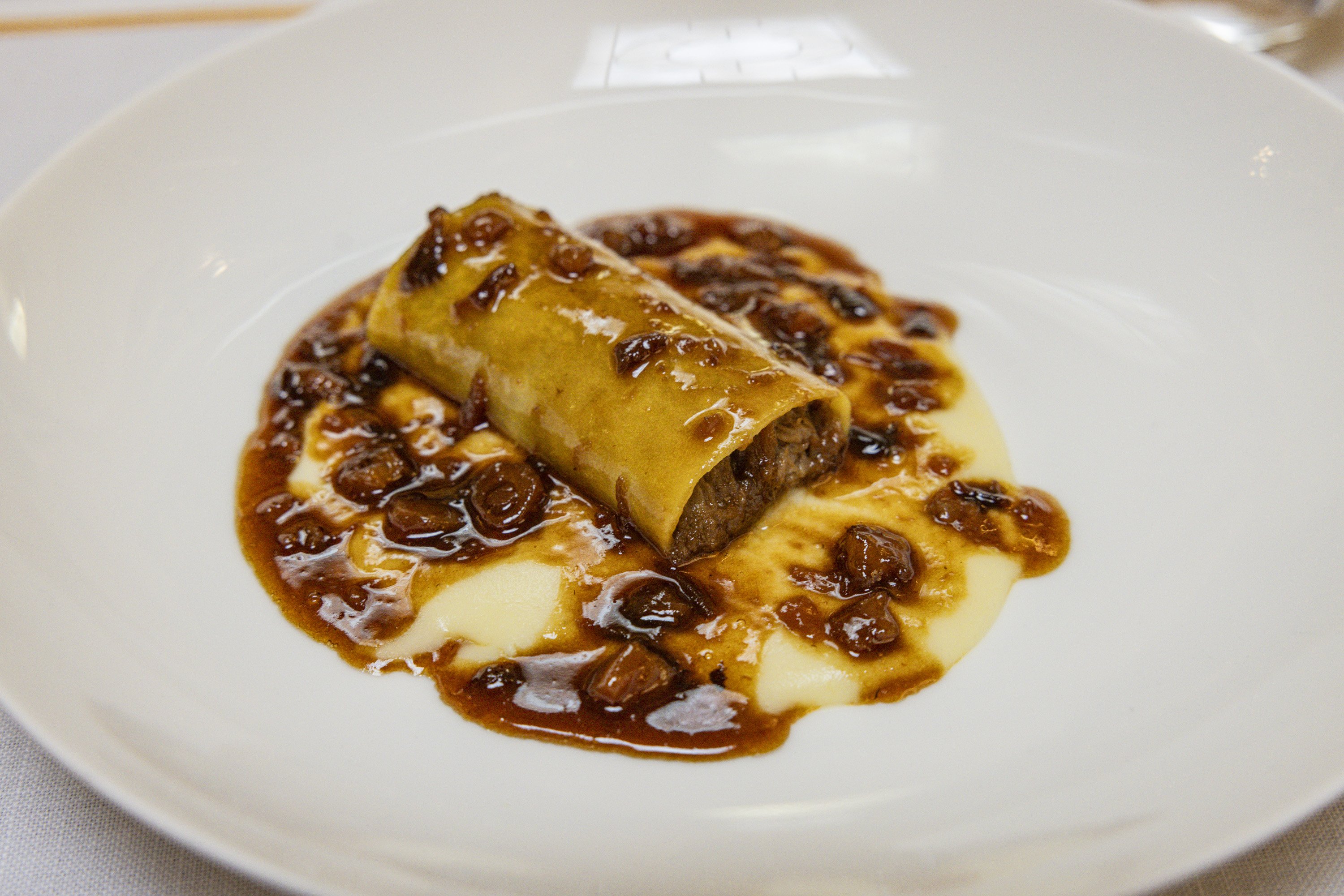 Como si se tratara del fenomenal dúo gastronómico de Enric Buendia y Aritz Ribalta, el acto principal del menú lo protagonizan el ya mencionado y alabado canelón de mejilla ibérica y una imperdible lubina asada, fondo de calamar y aceituna negra. Una pareja de ases que satisface y alegra todos los paladares: por una parte, los amantes de la carne; de la otra, los apasionados por el pescado|pez. En mi caso, uno irracional hacen de ambas delicatessen. Este último plato, por cierto, casado con un Brut Nature Reserva, Joan Sardà.