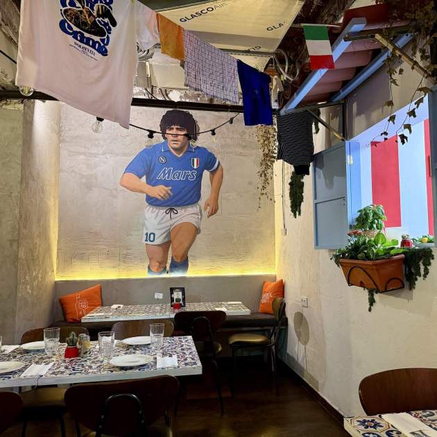 Desde el primer momento, el local desprende el encanto de una trattoria napolitana, sin lujos ni pretensiones, y con una decoración llena de detalles que te hacen sentir como si pasearas por un barrio de Nápoles. El dueño del local, napolitano, por supuesto, nos recibió con una sonrisa y el acento tan característico del sur de Italia. Con orgullo nos enseñó todos los detalles que conforman el restaurante: una icónica camiseta azul con el número 10 preside la sala como símbolo de devoción a Maradona, las mesas con mosaicos de azulejos coloridos recuerdan la cerámica tradicional de la región, y en el techo cuelgan prendas de ropa tendidas. Un antiguo teléfono público rojo de pared refuerza esta estética urbana, y una gran fotografía panorámica de Positano te transporta directamente a la costa amalfitana. Todo ello, una auténtica declaración de amor a Nápoles y a su manera de vivir.