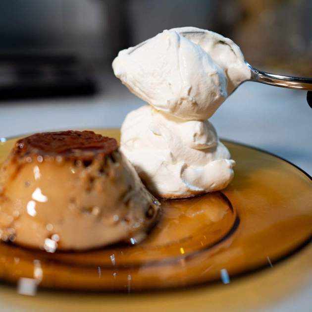 El menú, que tiene un precio de 24 €, incluye un café, tres medios bikinis, una tostada, un huevo frito y un flan. Una pequeña comida en formato brunch, a pesar de que no se refieran así, que tiene una buena relación calidad-precio. Los bikinis son muy buenos, y la tostada, con ventresca de atún y pimiento escalivado, es deliciosa; se nota que utilizan buen producto. El huevo frito también es bueno, a pesar de que sea de Galicia —¡sería fantástico si fuera de proximidad! El flan, para rematar la comida, puede ser de café o normal, acompañado de la nata casera para hacer un guiño a la mítica nata que servía el local durante la etapa de los Vendrell.