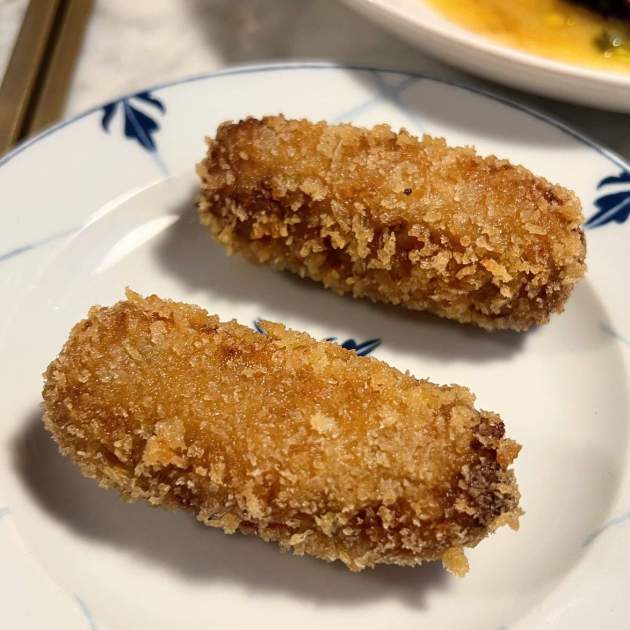 Las exquisitas croquetas de gamba, invitación de la casa, me llevan a pensar que es posible que la misma receta sea siempre mejor con marisco o setas que con carnes. Encuentro que la gamba aporta siempre el toque salado que requiere esta elaboración que a menudo dulcifica en exceso en muchas casas, supongo que por no haber salpimentado bien la bechamel.