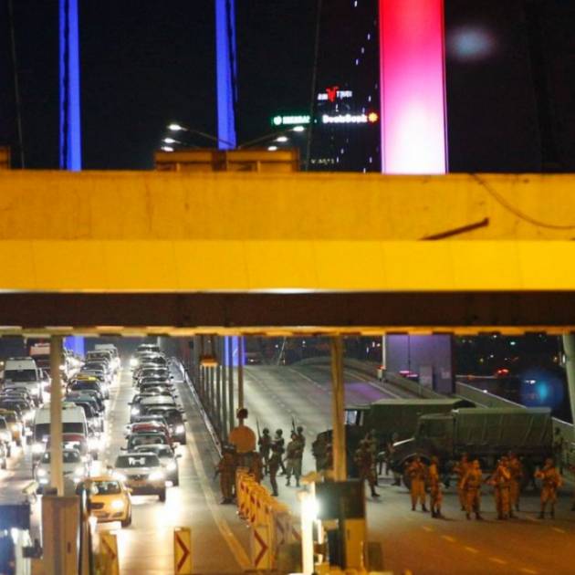Video from Istanbul bridge. Soldiers shout at passing cars "There is curfew, everybody go home." pic.twitter.com/8T2JeK5iTo