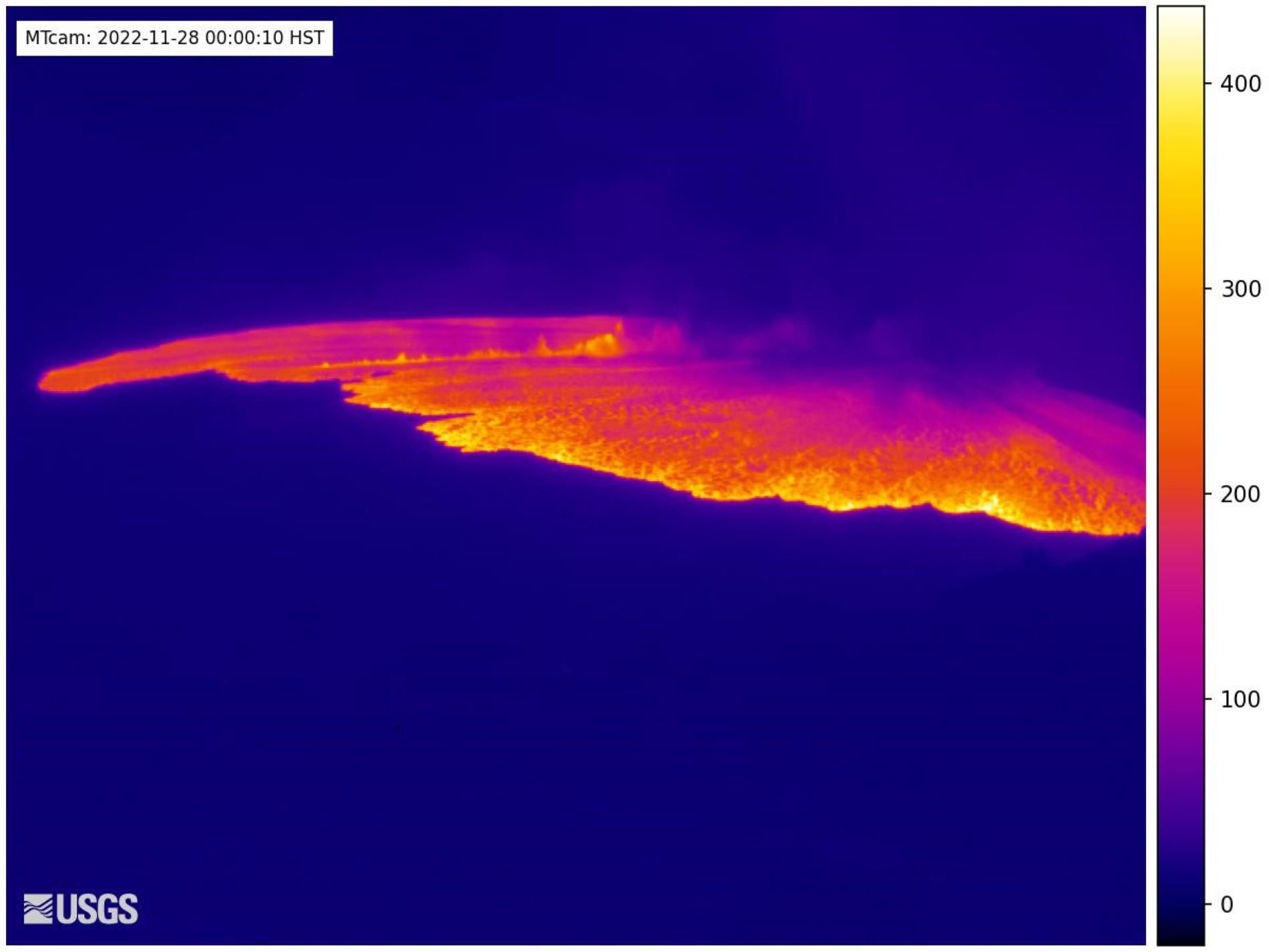 This short video shows thermal camera footage of the onset of the #MaunaLoa eruption from the volcano's summit. The temperature in degrees C is shown by the colored scale bar on the right. For additional information visit: https://t.co/rfwkMVSJKM #MaunaLoaErupts pic.twitter.com/PhHXbq9nNa