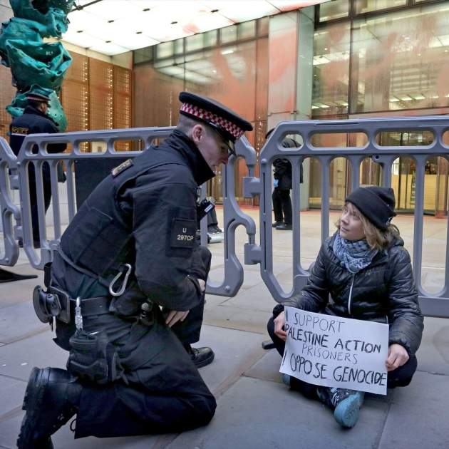 Fue detenida en la acción "Prisoners for Palestine" en Aspen Insurance en Londres, aseguradora de la empresa de armas israelí Elbit Systems. pic.twitter.com/3qBt3iRi9e