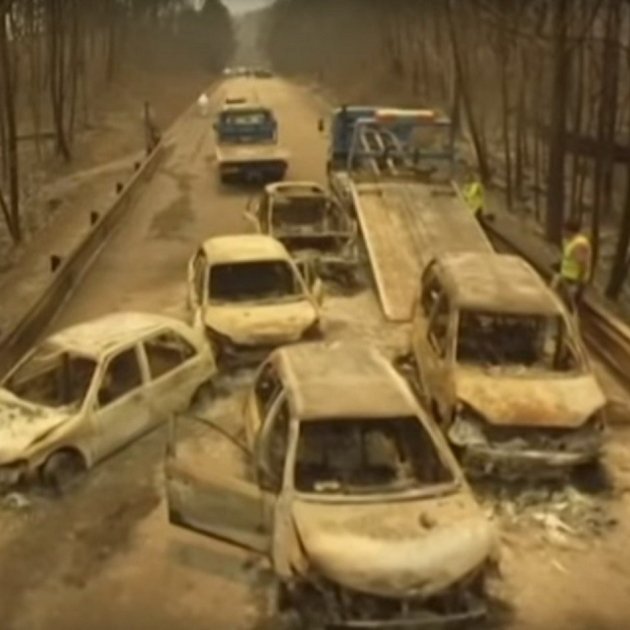 Unas imágenes duras donde se pueden ver coches completamente calcinados en medio de la carretera y camiones de bomberos y otros equipos de rescate. Todo en medio de un bosque deforestado y oscuro a causa del humo que queda atrapado en el ambiente.
