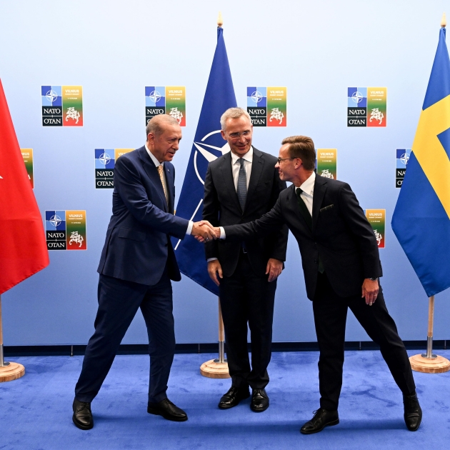 Imagen principal: el presidente turco Recep Tayyip Erdogan (a la izquierda) da la mano al primer ministro sueco, Ulf Kristersson (a la derecha), mientras el secretario general de la OTAN Jens Stoltenberg (en medio) mira durante su reunión antes de la cumbre de la OTAN en Vilna, Lituania, el pasado 10 de julio de 2023 / Efe