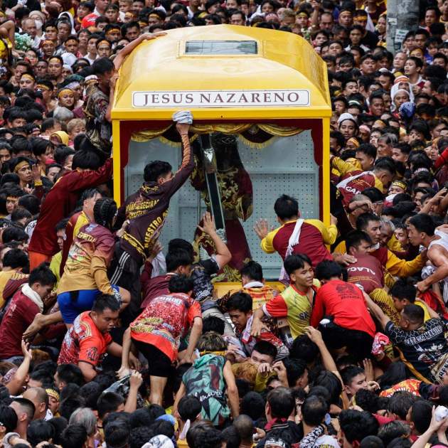 Como cada año, el Cristo de piel oscura —con el que se identifican millones de personas en Filipinas— fue trasladado desde la explanada del Grandstand Quirino hasta la iglesia de Quiapo, un periplo difícil de completar debido a la multitud que se abalanza sobre el carruaje que lleva al Nazareno e impide su avance. Un grupo de cofrades, que lleva la imagen por las calles de la ciudad y acompaña la procesión, protege la vitrina del Cristo y baja a quienes intentan colgarse de ella para hacer sus plegarias.