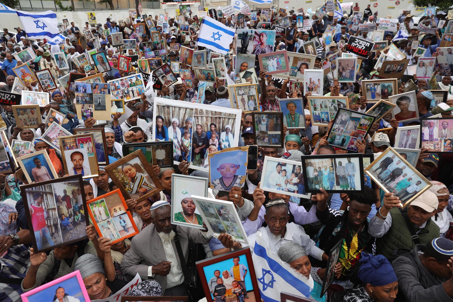 28/05/2023. Los judíos etíopes muestran fotografías de familiares que todavía se encuentran en Etiopía, durante una marcha de protesta hacia la oficina del primer ministro de Israel en Jerusalén. Los manifestantes piden en el gobierno que permita a los judíos etíopes en Etiopía, nombrados Falash Mura, para unirse a sus familiares en Israel. / Foto: Abir Sultan / Efe/Epa.