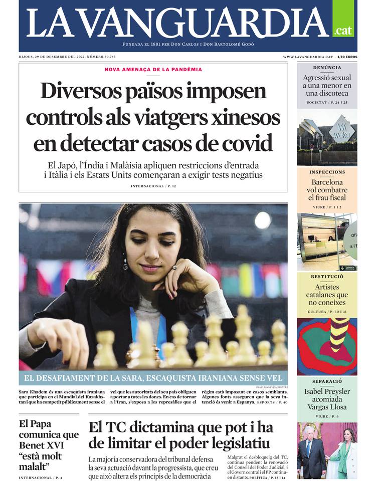 En los diarios, digamos más gubernamentales, pesa más en las portadas la expansión de la covid-19 en China y el miedo a que, otra vez, la confusión sanitaria de ese país se contagie al resto del mundo como en la pandemia de 2020. Hasta ahora, China ha aplicado una política de contención de infecciones muy dura,"Covid-zero", basada en prevenir la circulación del virus a cualquier precio: cuarentenas estrictas que aíslan el país, cierre de ciudades enteras, confinamientos crueles que han afectado a 300 millones de chinos, controles diarios estrictos, pasaportes sanitarios obligatorios....
