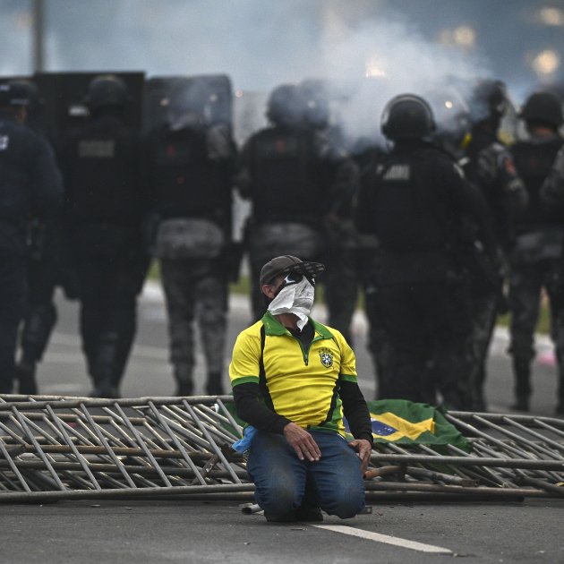Imagen principal: manifestando bolsonarista ante la policía antidisturbios que accedía al palacio presidencial / Efe