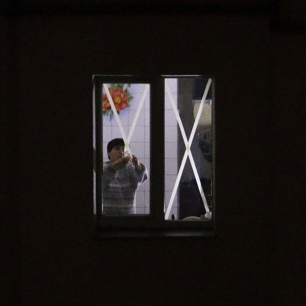 Imagen principal: una mujer saca las protecciones de las ventanas para evitar que se rompan por los bombardeos. El piso está iluminado por luz desconectada, durante un apagón en la capital / Efe