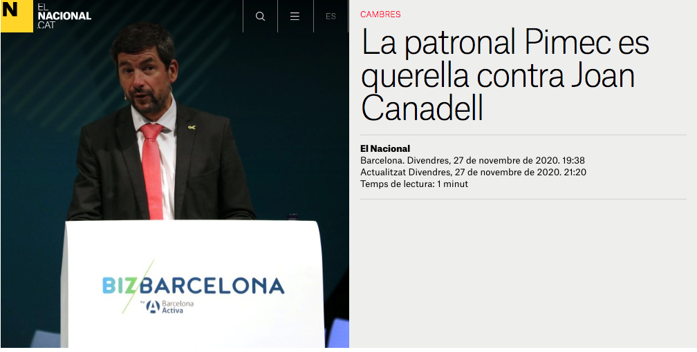 1. La patronal de la pequeña y mediana empresa Pimec, que junto con Fomento del Trabajo Nacional, es la principal organización empresarial de Cataluña, ha decidido querellarse contra Joan Canadell, presidente del Consejo de Cámaras y de la Cámara de Comercio de Barcelona. Canadell osó denunciar, sin mencionar a Pimec, que existen patronales que llevan 25 años sin elegir presidente, escogiéndolo a dedo. Josep González se sintió aludido porque, efectivamente, es presidente de Pimec desde 1997, cuando la antigua patronal del Baix Llobregat, Sefes, que él también presidía, se fusionó con Pimec. Hay dirigentes patronales y sindicales que se pegan a las sillas con cola. Una vieja costumbre del régimen del 78.