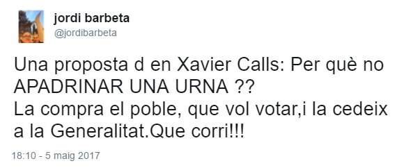Pues eso, 8 mil catalanes compramos una urna, o la compramos entre unos cuantos, y el día que se vote, la cedemos. Y al día siguiente, la recuperamos. Y entonces la guardamos, como tenemos guardada la antorcha olímpica con la que hicimos el tramo correspondiente, la camiseta de Wembley, la del Tamuzado o la que cada club tenga como importante.