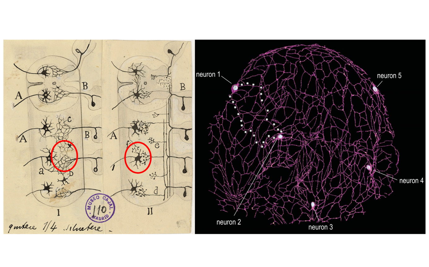 Para que lo podáis ver con vuestros ojos, os adjunto aquí uno de los dibujos de Ramón y Cajal, donde compara las conexiones en la médula espinal entre neuronas según la Teoría reticular y su Teoría neuronal. Sutil, pero diferente. Al lado os adjunto la imagen obtenida por los científicos que han analizado imágenes para reconstruir tridimensionalmente parte del sistema nervioso de los ctenóforos, protagonista de este artículo tan relevante recién publicado en Science, una verdadera red de neuronas.