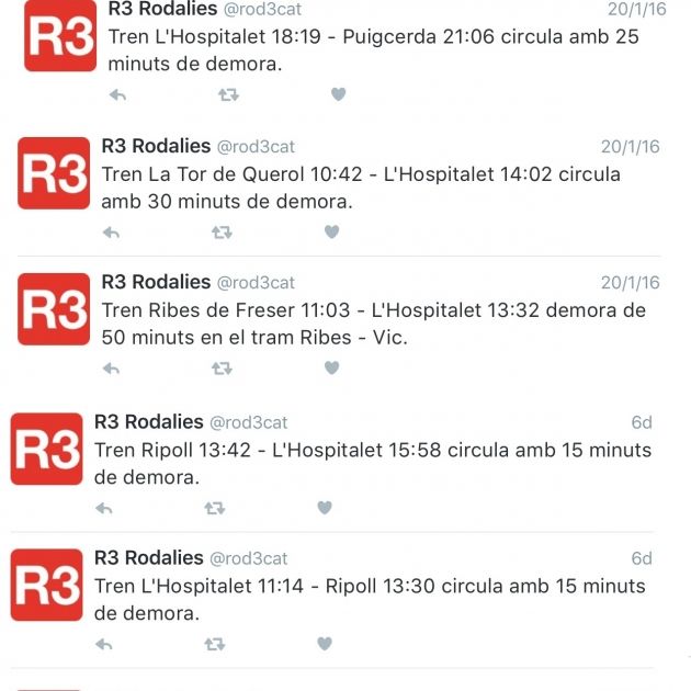 Empezamos por la línea de Tortosa, también conocida como la de los 20 minutos porque los trenes tienen la simpática costumbre de ir siempre con 20 minutos de retraso. Repasamos sólo incidencias de los últimos tres días: