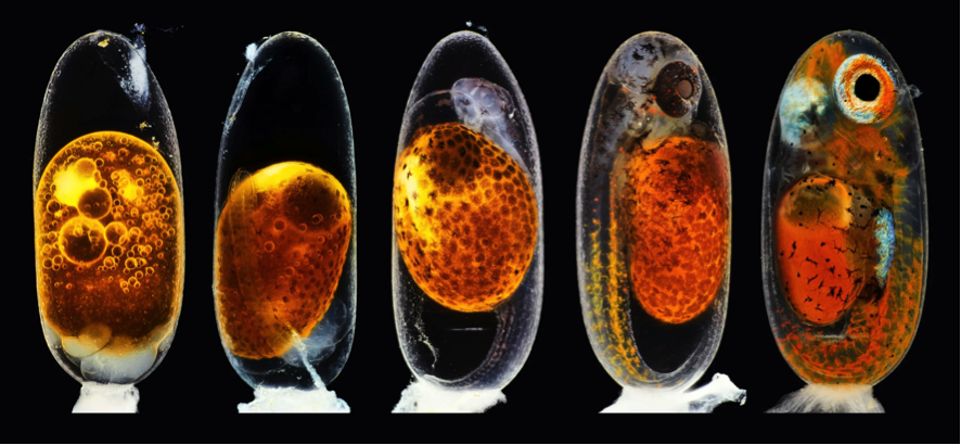 Evidentemente, todas las imágenes escogidas son espectaculares, cada una dentro de su ámbito. Desde una fotografía obtenida desde un telescopio mostrando que la invasión de satélites en el cielo nocturno enturbia y dificulta el estudio de las estrellas a cómo un rayo láser puede segar una célula cancerosa y revelar su interior. Os recomiendo que las miréis todas, pero yo describiré brevemente las que me han impactado más y, tengo que admitir, no me importaría que decoraran la pared que miro buscando inspiración. La primera foto que he escogido muestra el desarrollo embrionario de un pez payaso (Amphiprion percula, como el pez Nemo de la película de Pixar/Disney) dentro del huevo, transparente. Con una precisión exquisita y una cautivadora composición cromática, podemos ver juntas las imágenes del desarrollo del embrión dentro de un mismo huevo, a días 1, 3, 5 y 9 posfecundación: desde una masa de células donde cuesta distinguir algo concreto, hasta ver un pez con el ojo perfectamente formado, a punto de salir del huevo. Esta fotografía ha ganado el concurso Nikon Small World, que recibe imágenes absolutamente fascinantes del mundo científico.