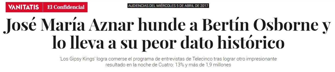 Y las respuestas son que 1/ Aznar interesa más a los comunicadores que a la audiencia, 2/ el formato del inicio del programa fue demoledor. Empezó en las 22.00 para evitar competir con El Hormiguero (A3. o sea, la competencia) y se pasaron media hora avanzando contenidos, de manera tal que la entrevista realmente no empezó hasta las 10 y media y la gente desertó, 3/ la duración eterna de un programa que acabó pasados la 1 y media. ¡¡¡TRES HORAS Y MEDIA DE AZNAR!!! Y con seis cortes publicitarios de más de seis minutos... ¡¡¡ETERNO!!! y 4/ y el punto más importante pero menos evidente de todos: el contenido de la charla.