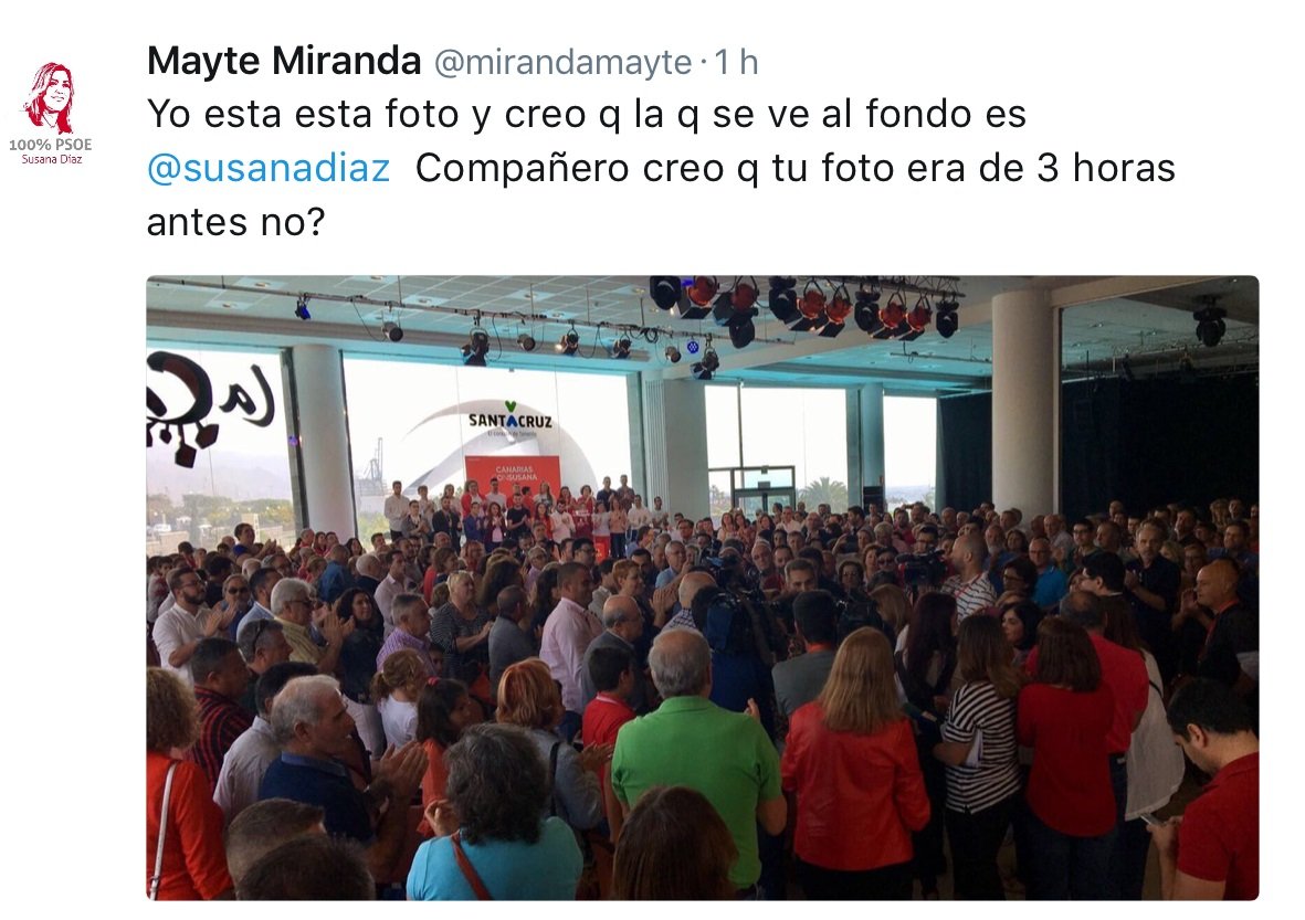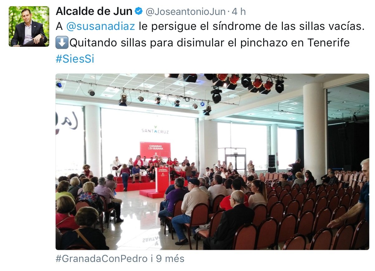 La guerra mediática que libran Susanistas y Pedristas en twitter es realmente interesante. Propaganda va, propaganda viene. Los unos hinchan sus actos y a los otros los desinchan. Y viceversa. El pasado fin de semana sucedió en Canarias. El alcalde de Jun, un muy conocido socialista de base y con mucho seguimiento por parte de las bases (y Pedrista), tuiteó eso: