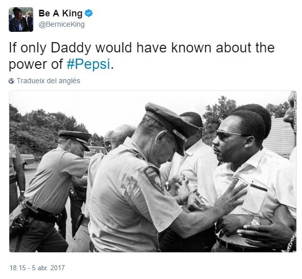 "Si papá hubiera sabido el poder de Pepsi", decía Bernice. Y la marca tuvo que retirar el anuncio. Un anuncio que, mientras se retiraba, era visto por todo el mundo y sin necesidad de ser emitido por ninguna TV. Es decir, sin tener que pagar. A cambio, tuvieron que soportar infinidad de memes donde se ironizaba sobre la presencia de la marca en momentos importantes de los movimientos de protesta: