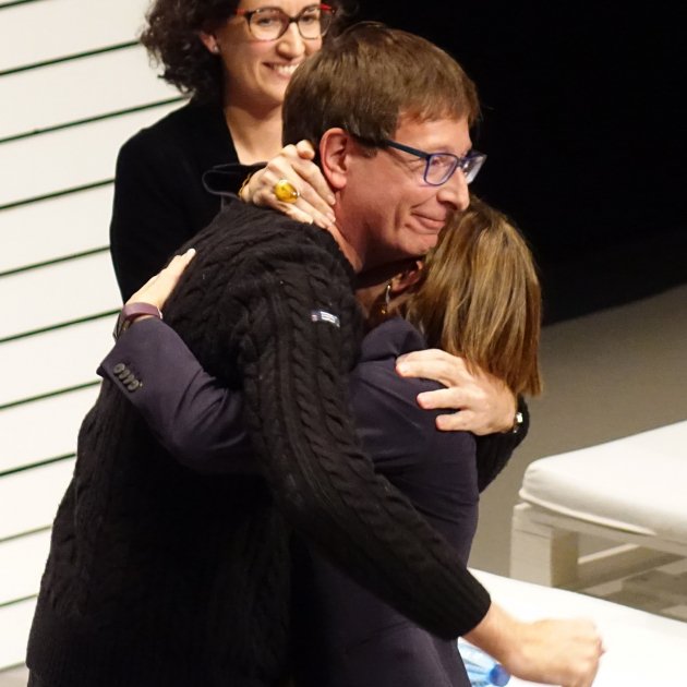 La presidenta del Parlament, Carme Forcadell, saltó de su silla situada en tercera fila, voló hacia el escenario y se lanzó a sus brazos. Fue un abrazo con molinillo. Sí, ¿sabe cuándo abrazas a alguien y el abrazo es tan intenso que la unión resultante gira a derecha e izquierda? Pues eso.