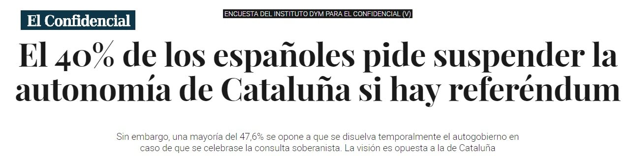 Un buen ejemplo lo encontramos en El Confidencial. Pregunta: ¿Usted suspendería la autonomía catalana en caso de que celebren el referéndum? Respuesta de los españoles: un 47,6% no y un 40% sí. ¿Cuál es el titular?