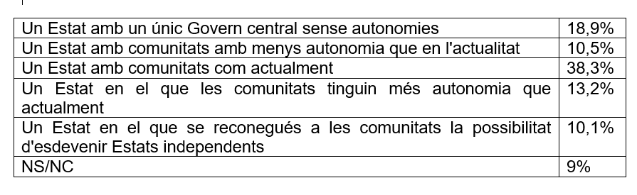 Ahora viene el segundo punto. Un sistema federal para España que disfrutara de notas como las esbozadas aquí ¿alguien lo avista en un horizonte, no ya a corto plazo sino a medio plazo (a largo plazo, cómo dijo Keynes, todos muertos)? Me da la impresión que no y más cuando el sentimiento autonomista no llega el 39% de la población. En efecto, según el Barómetro del CIS de octubre de 2016, en la página 89, se puede ver el cuadro resultante de la pregunta 24, es decir, la opinión de los encuestados sobre algunas fórmulas alternativas de organización territorial del Estado en España. El resultado no es muy alentador para el statu quo tal como se puede ver en este resumen de elaboración propia a partir del mencionado Barómetro: